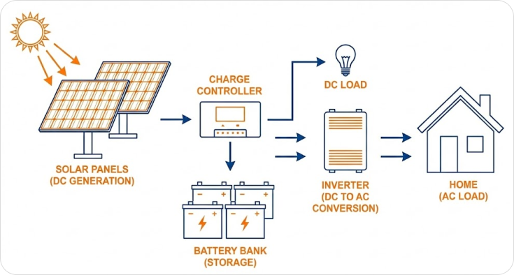 Now, let’s break down the entire off-grid solar system component by component so you can understand the role of each individual component in electricity generation.